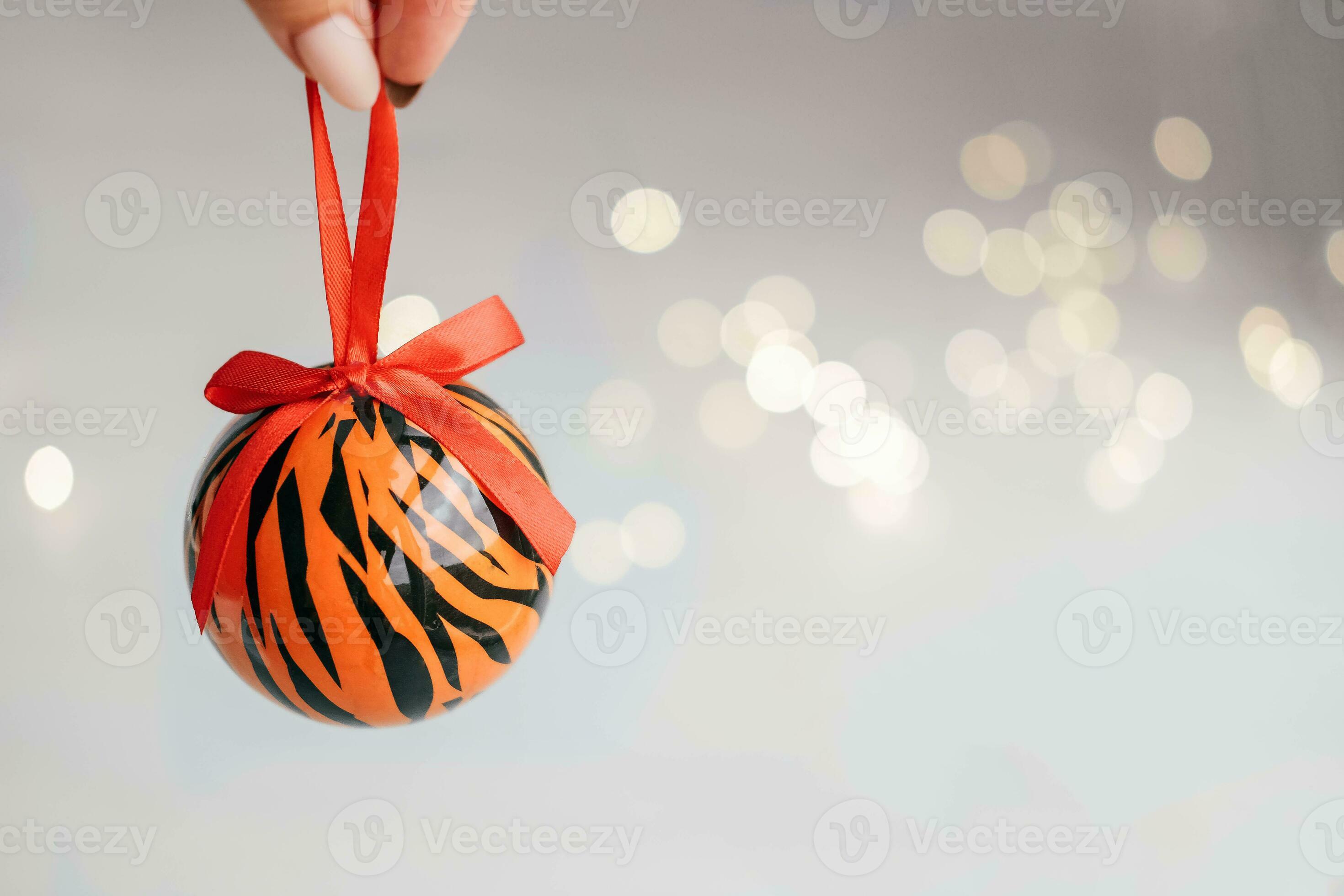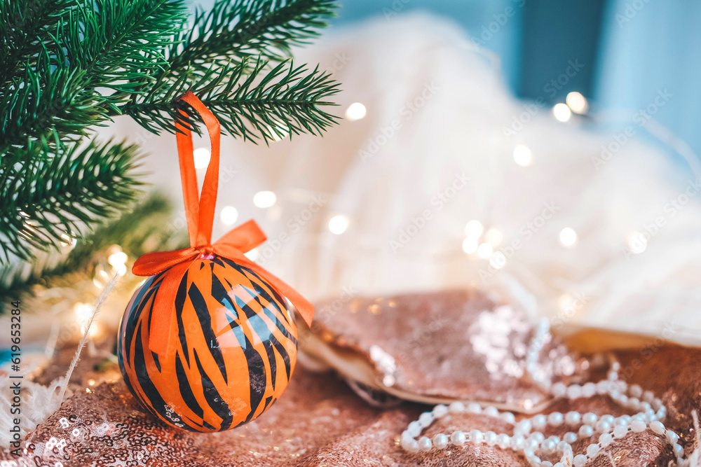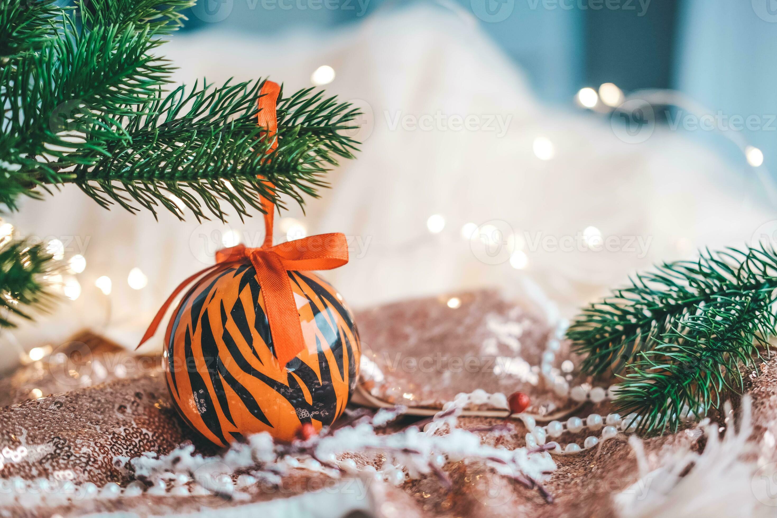 Christmas ball painted as tiger stripes spins on blurred christmas