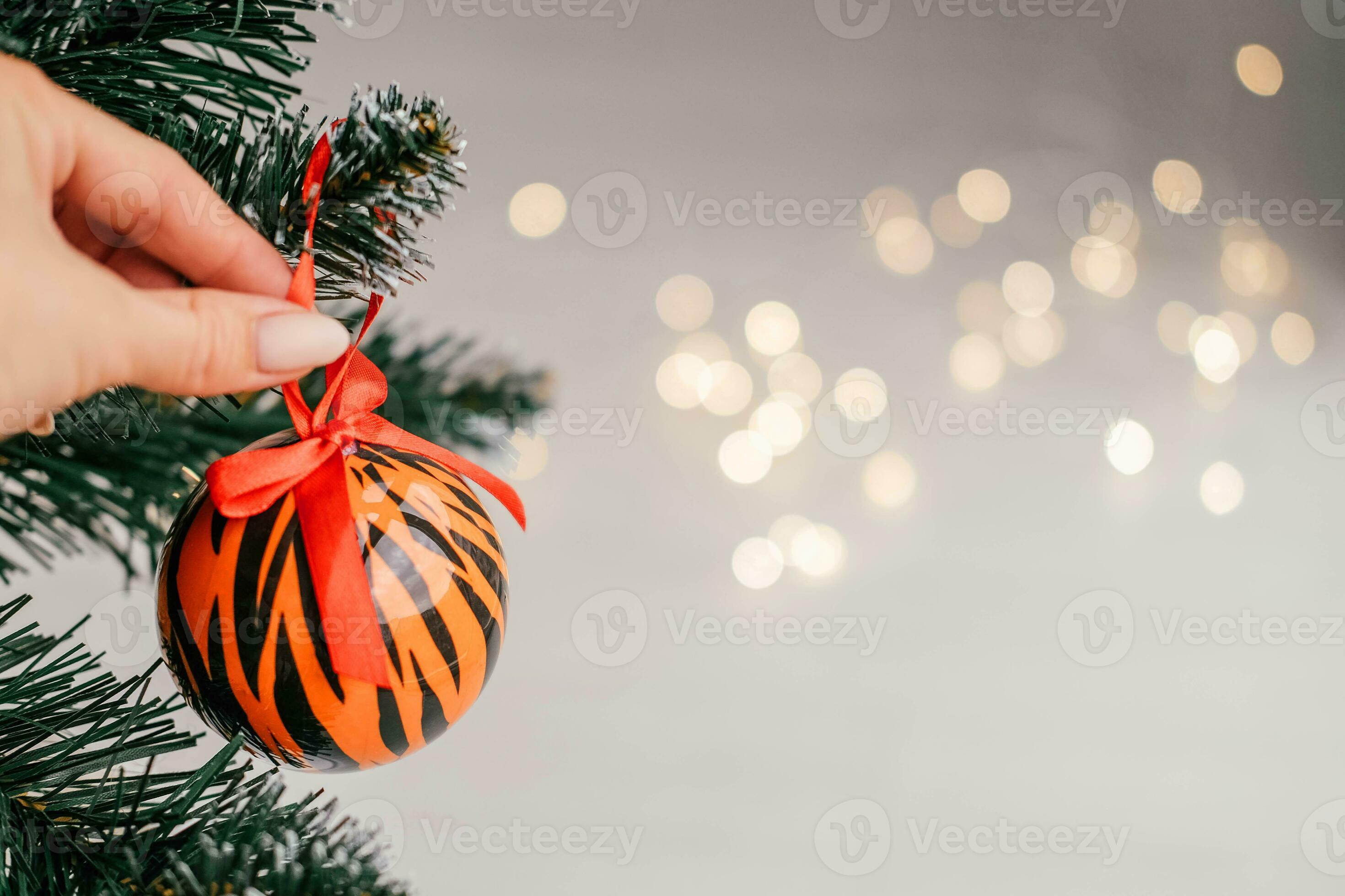 Christmas ball painted as tiger stripes on Christmas tree with a