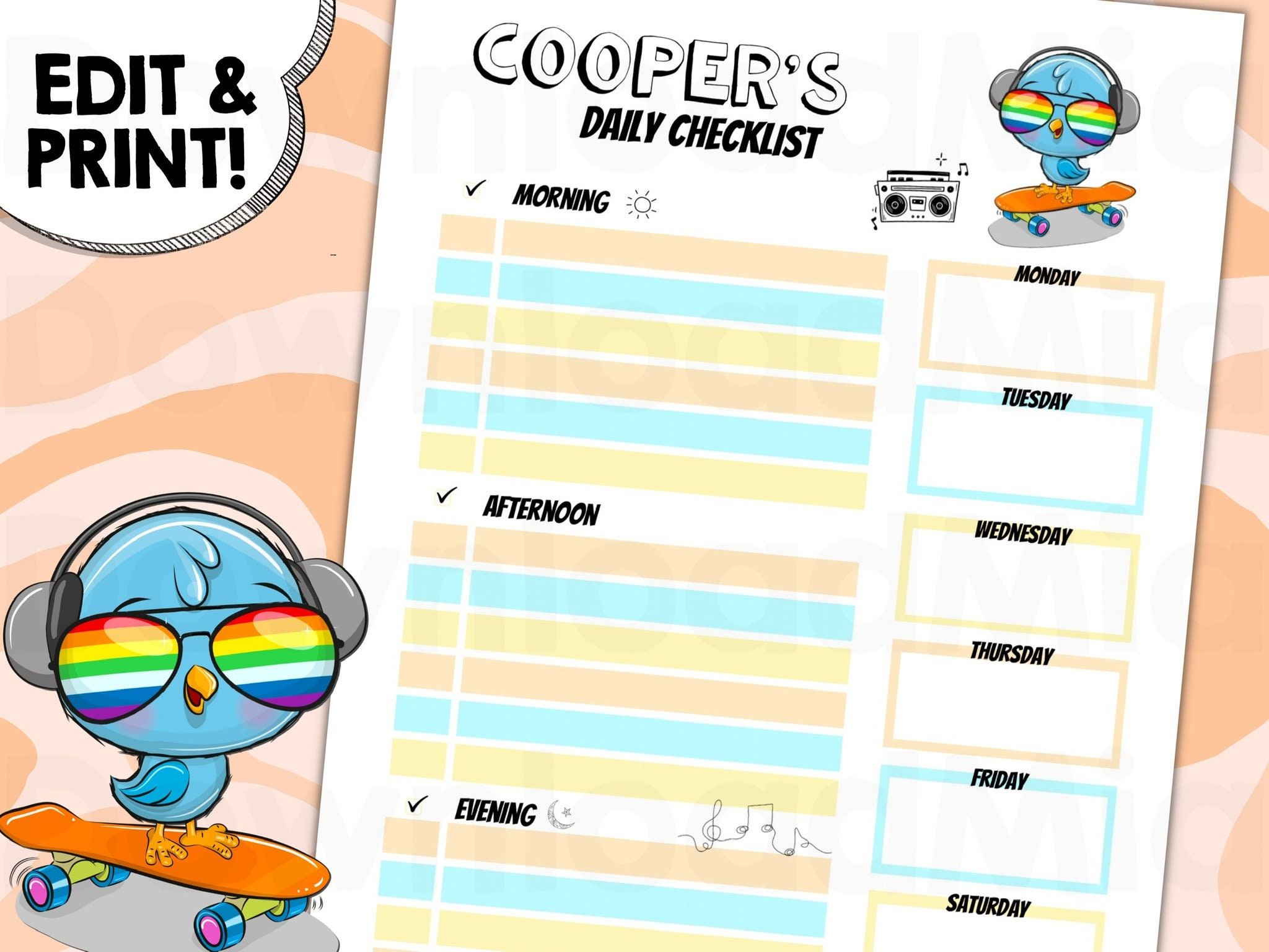 Kids Checklist Chore Chart Responsibility Editable Boy Cool Fun