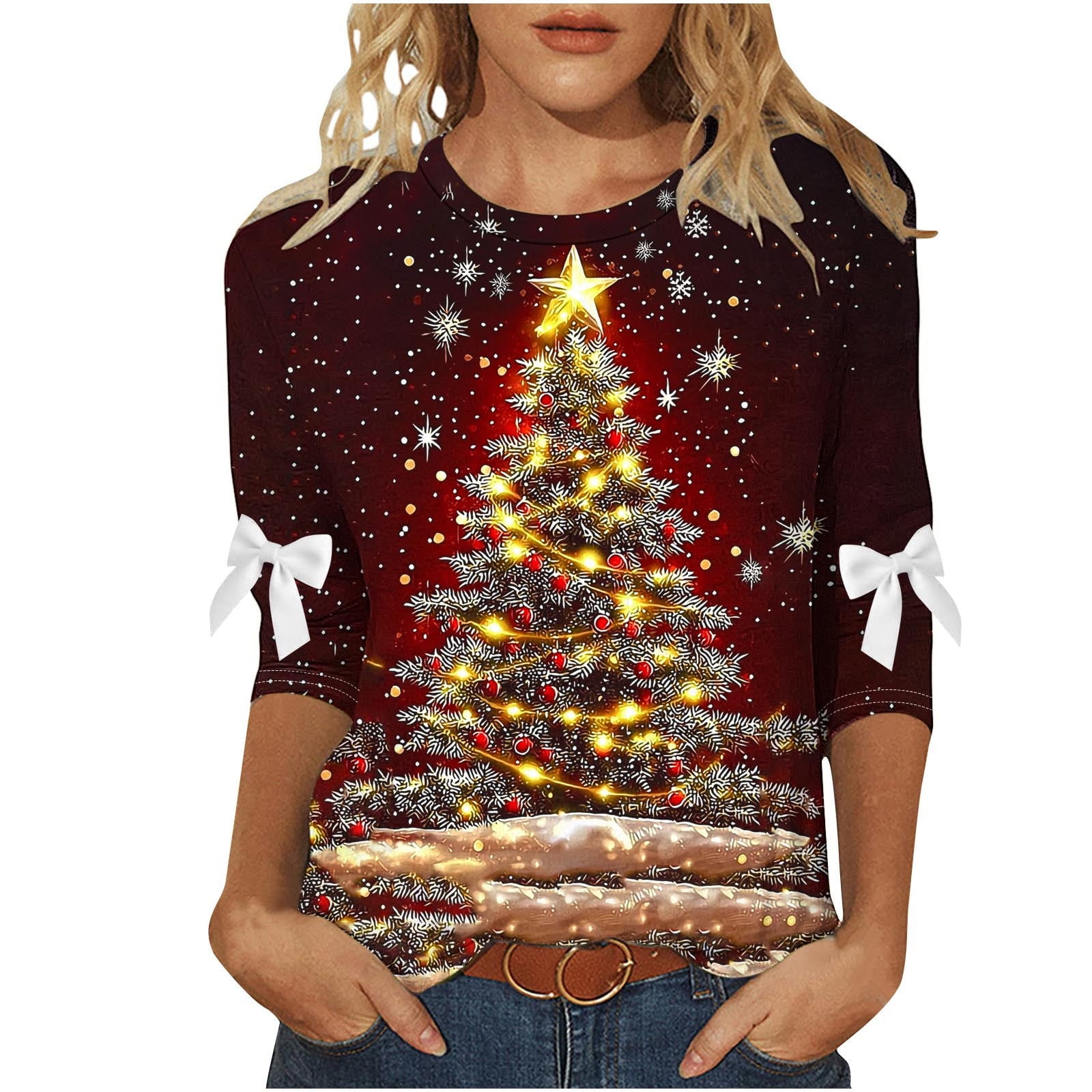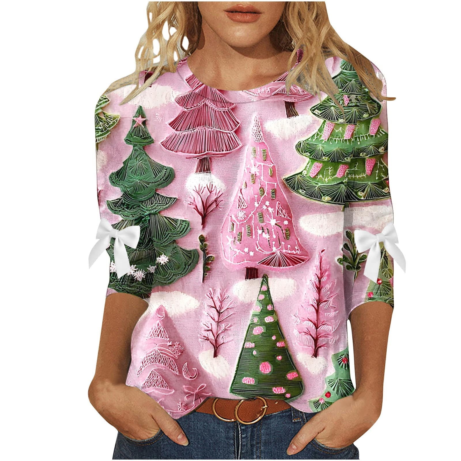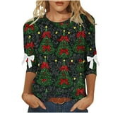Bzhegqhd Women #39 s Christmas Holiday Bow Knot Tops 3/4 Sleeve T Shirt