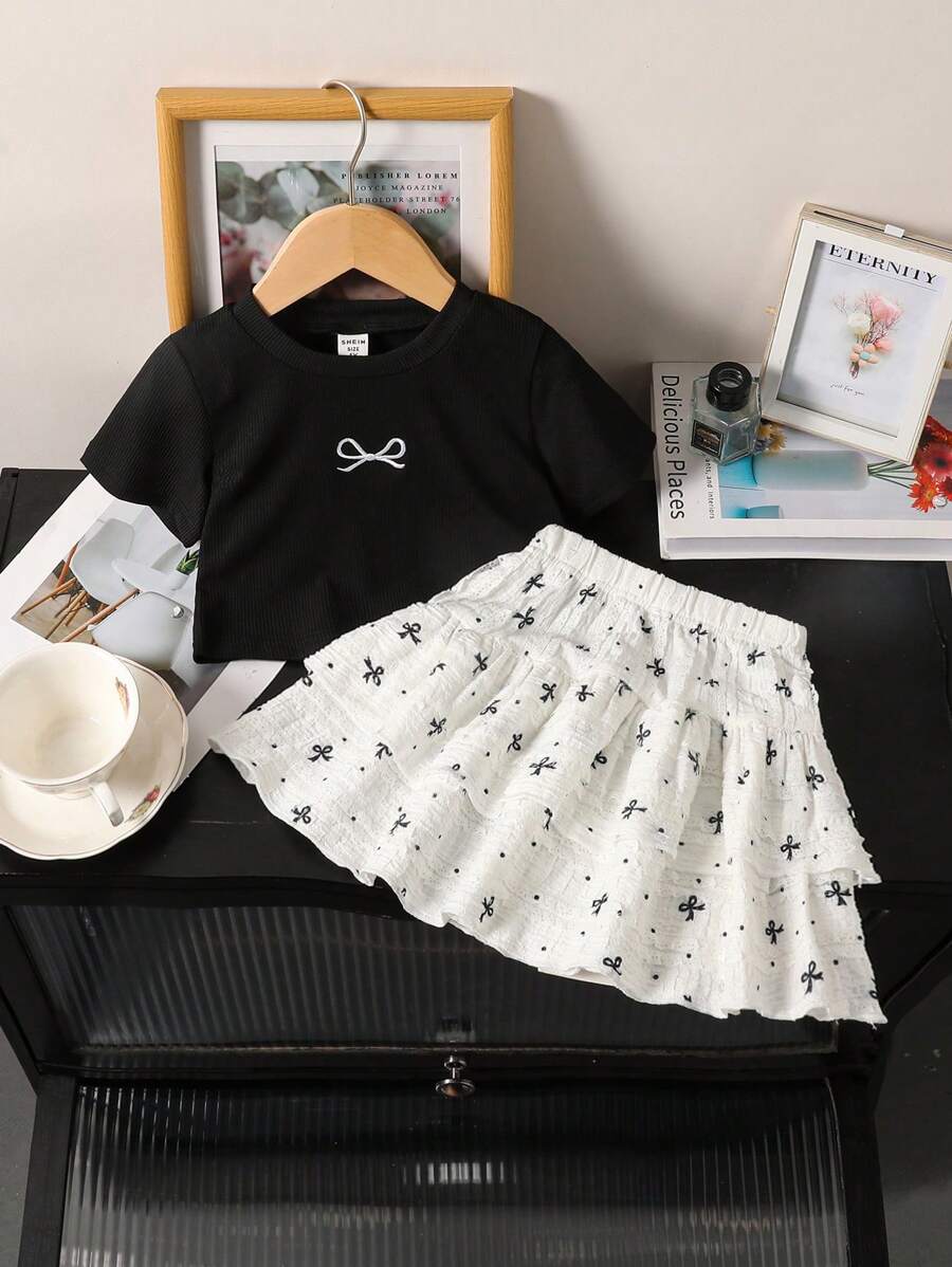 Young Girls #39 Bow Print Round Neck Short Sleeve T Shirt And Sweet Mini