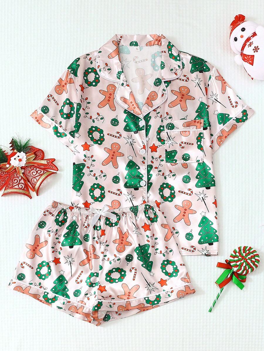 2pcs Satin Pajama Set Christmas Tree Gingerbread Man Print Short