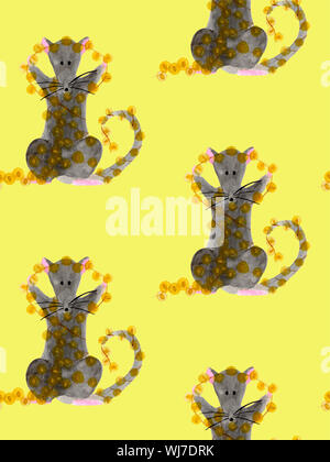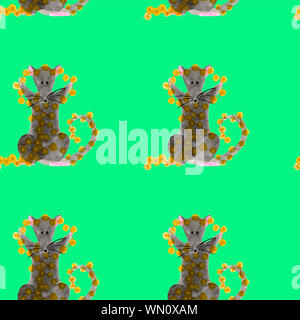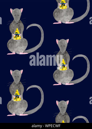 Seamless watercolor pattern with christmas rat sitting on blue ornament