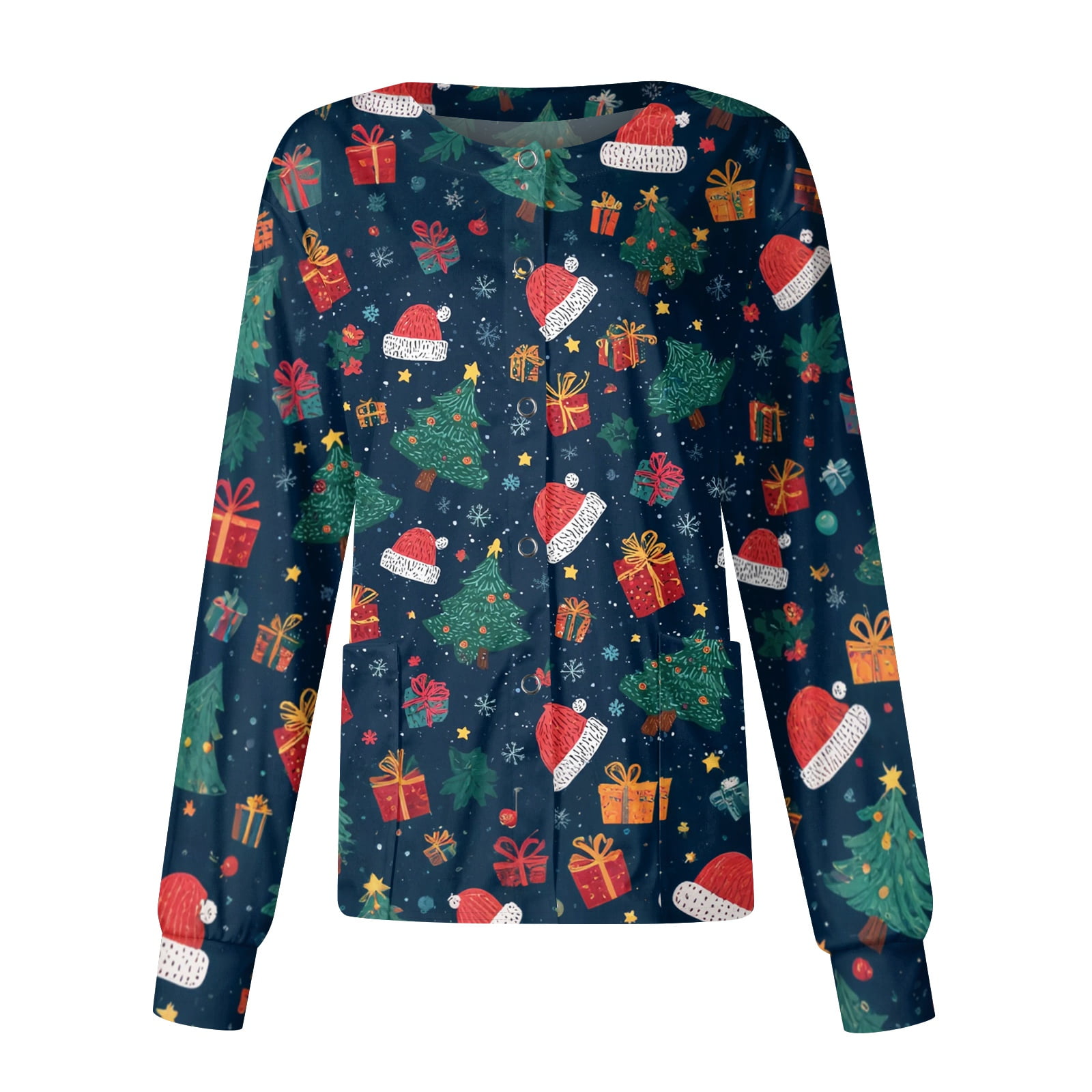 Christmas Scrub Shirts for Women Plus Size Snap Front Cute Xmas Print