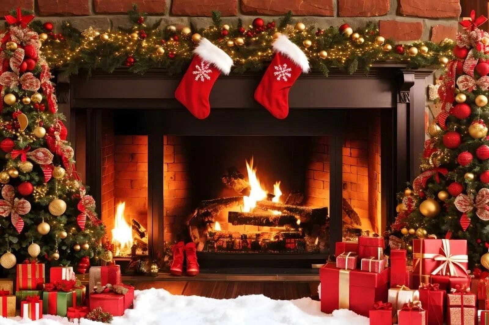 Christmas Fireplace Backdrop Rustic Red Brick Wall Interior Xmas Tree
