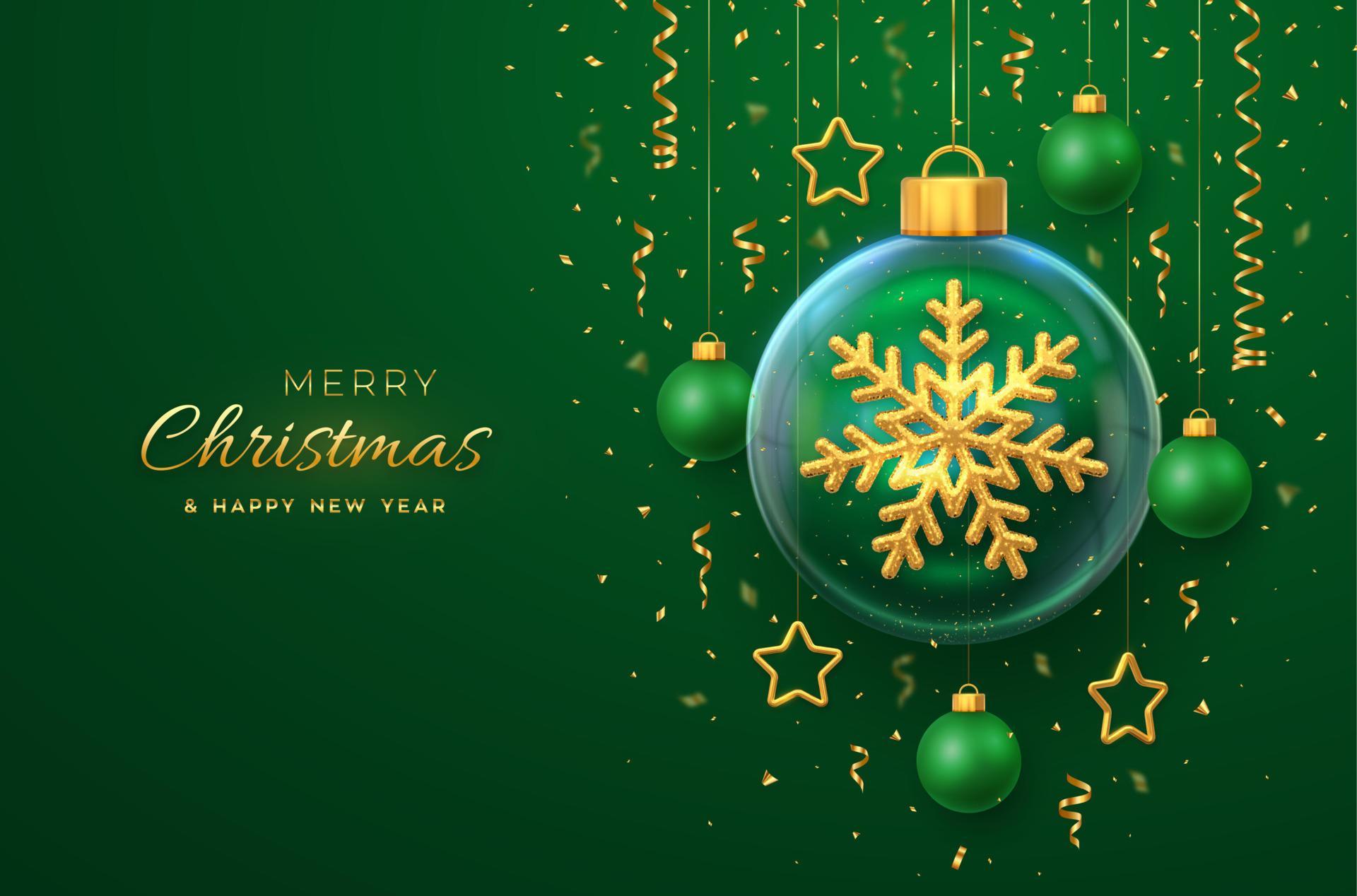 Merry christmas greeting card Golden shining 3D snowflake in a glass