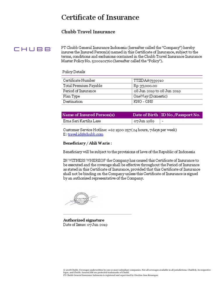 Certificate of insurance jul 2018 jun 2019 Chubb Insurance Singapore