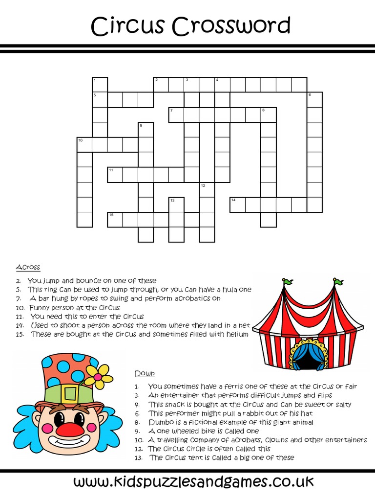 Big Top Circus Tent And Performers Crossword Grid Worksheet Template