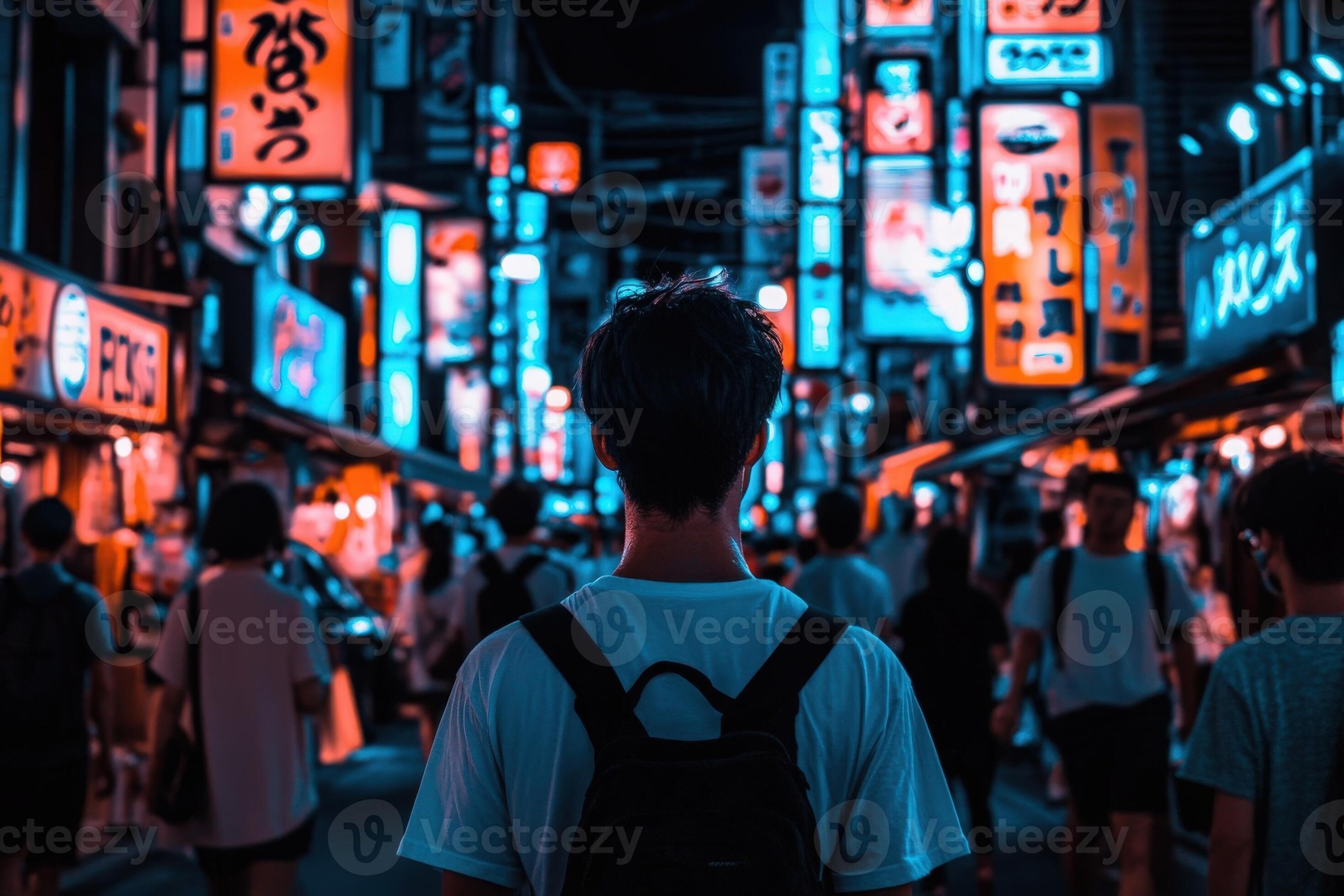 Beneath vibrant neon lights people wander through Tokyos bustling