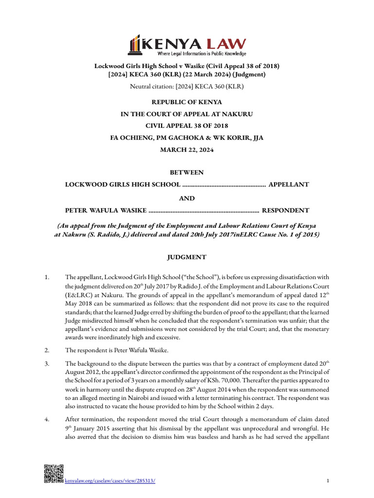 Lockwood Girls High School v Wasike (Civil Appeal 38 of 2018) 2024
