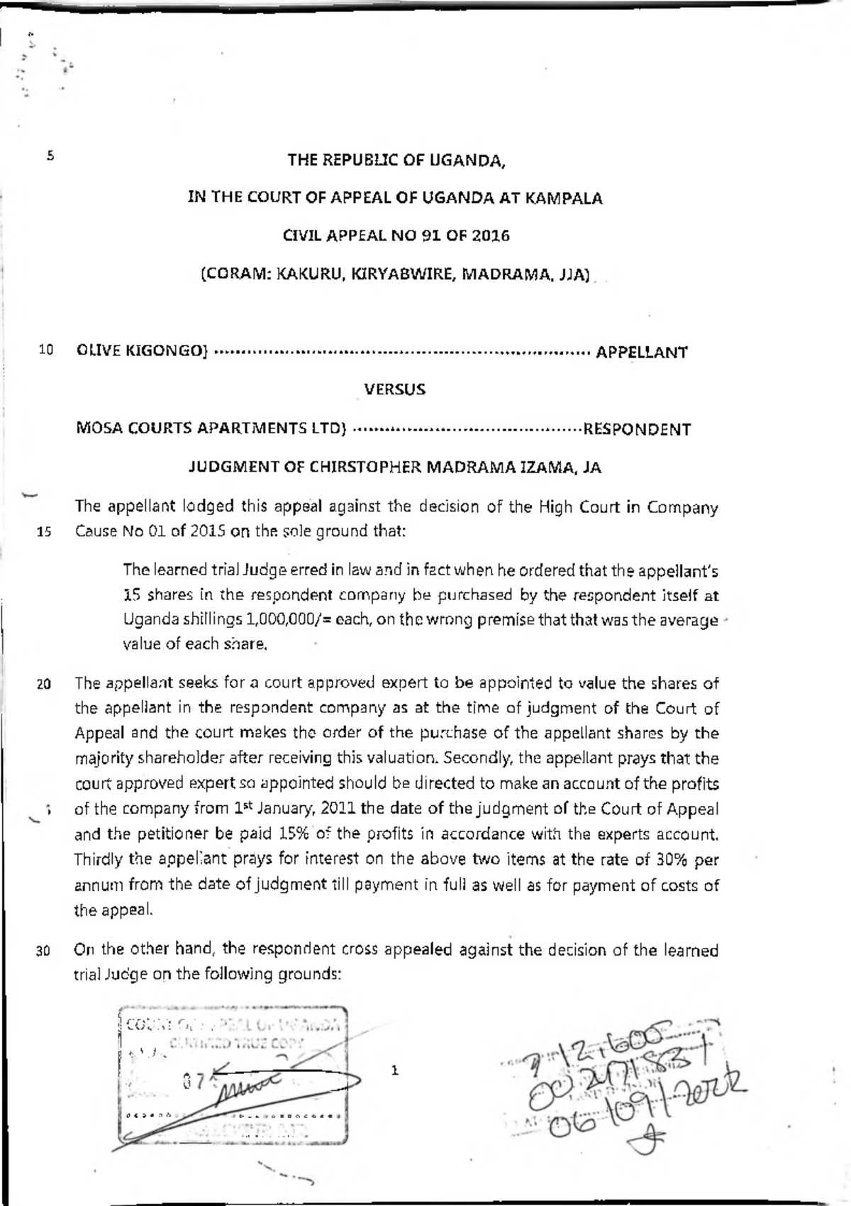 Civil Appeal No 91 of 2016: Olive Kigongo v Mosa Courts Apartments