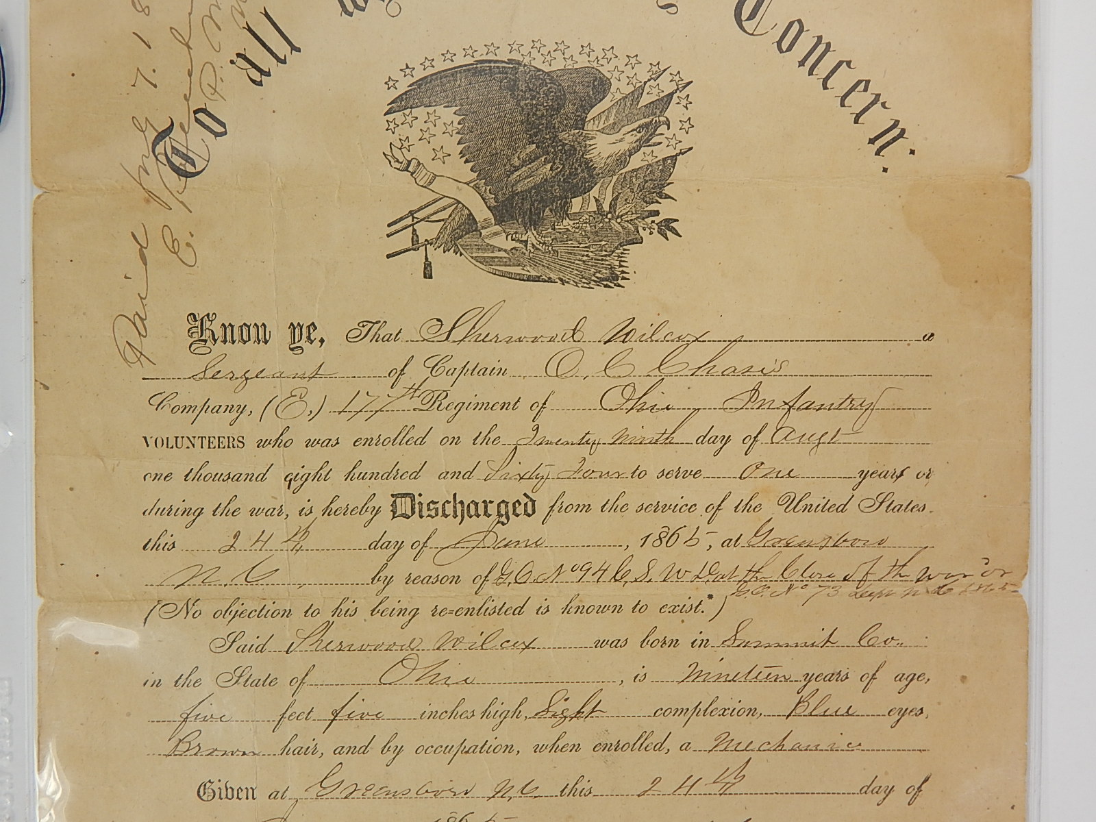Sold at Auction: CIVIL WAR DISCHARGE CERTIFICATE