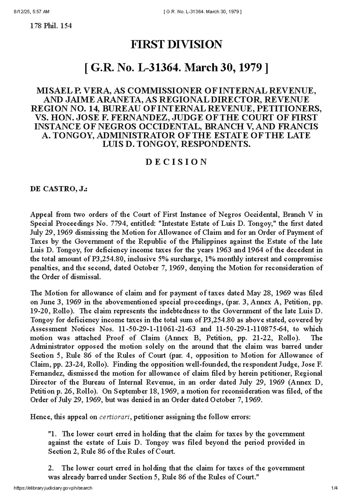 G R No 178 Phil 154: Decision on Tax Claim Against Estate of Luis D