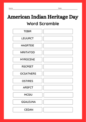 American Indian Heritage Day Word Scramble Puzzle Worksheet Activity