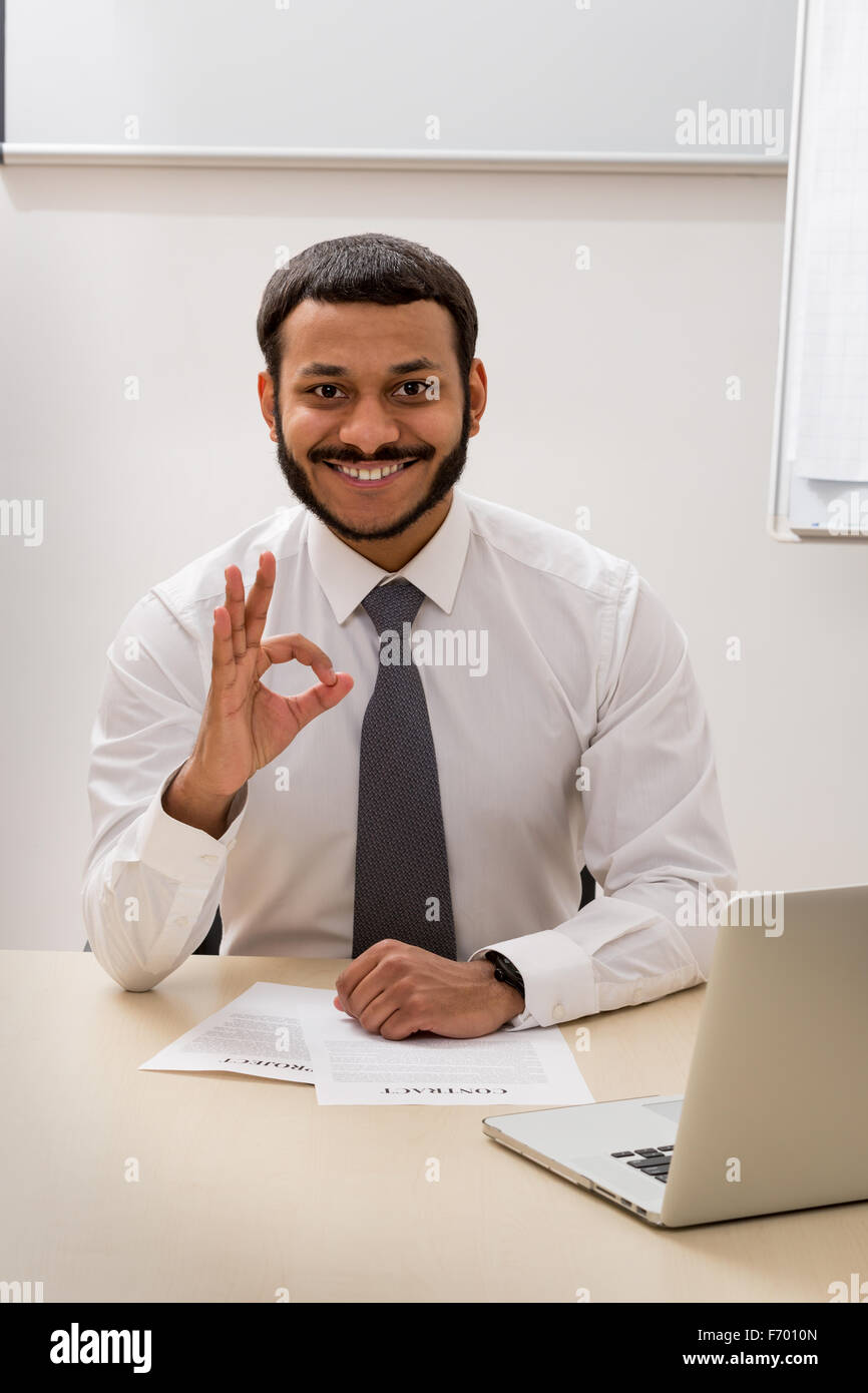 Confident smiling supermarket clerk posing at the shopping mall retail