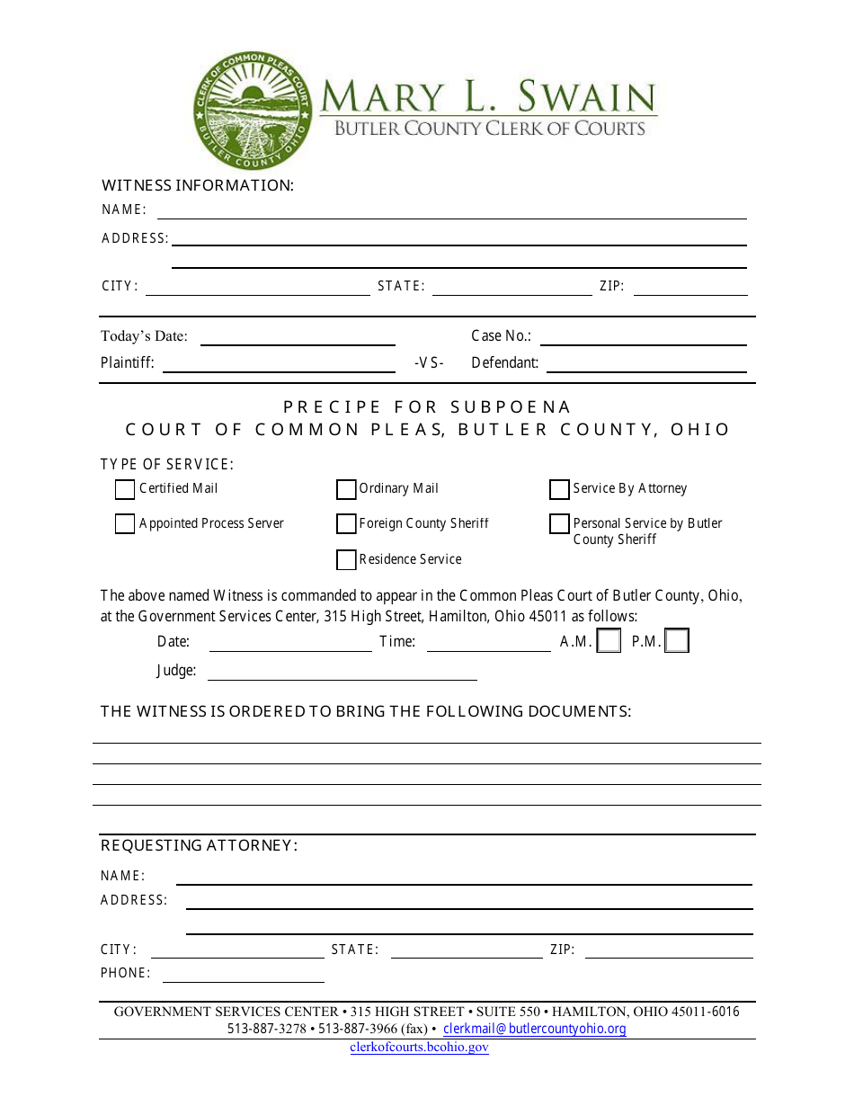 Butler County Ohio Precipe for Subpoena Fill Out Sign Online and