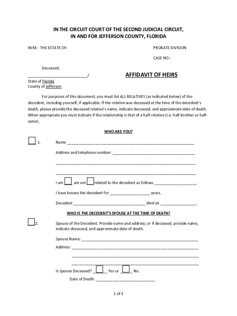 Fillable Online AFFIDAVIT OF HEIRS Jefferson County Clerk of Courts