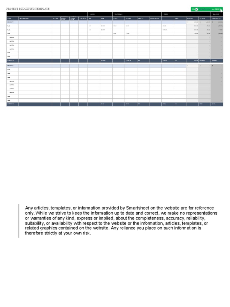 Multiple Project Budgeting Template: Subtask Subtask Subtask Subtask