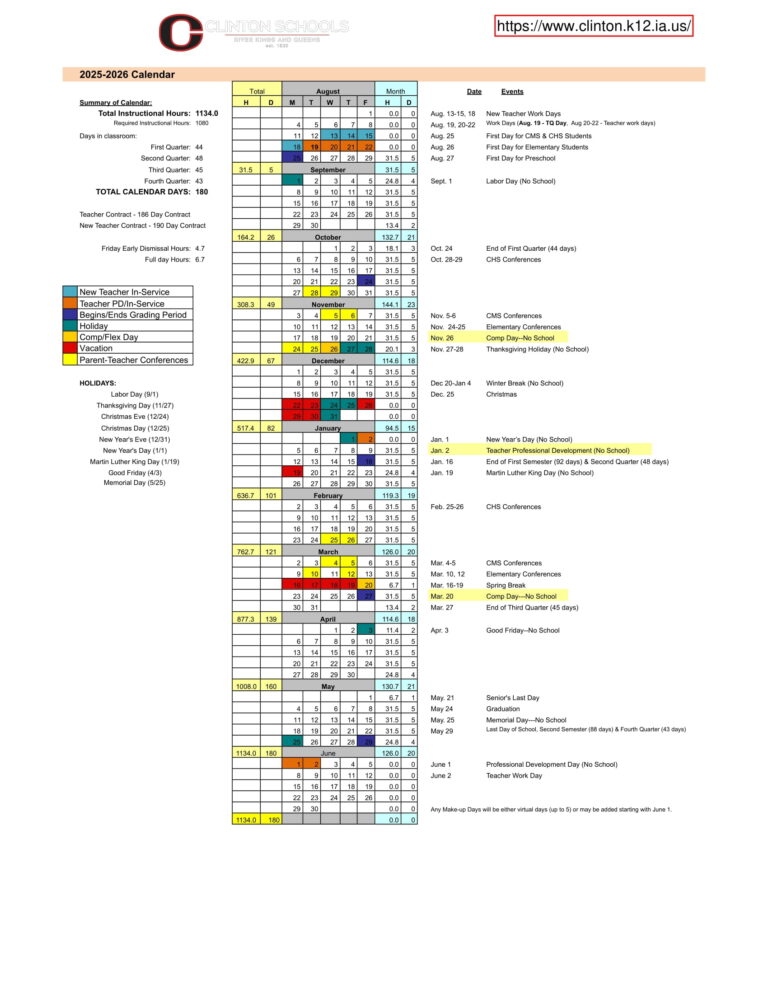 2025 2026 School Year Calendar Clinton Community Schools