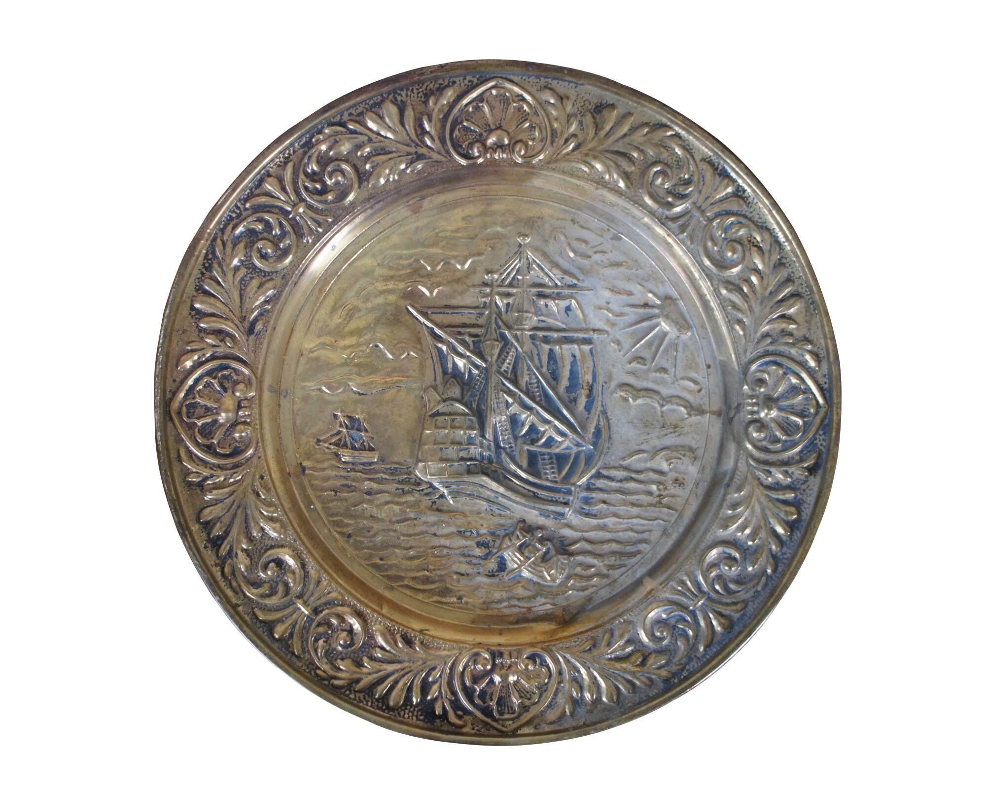2 Brass Repousse Nautical Maritime Seascape Clipper Galleon Charger