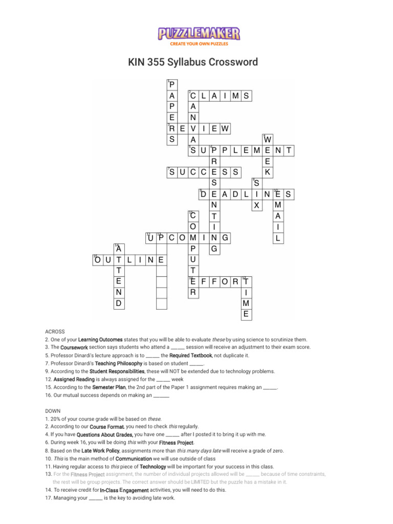KIN 355 Syllabus Crossword PDF