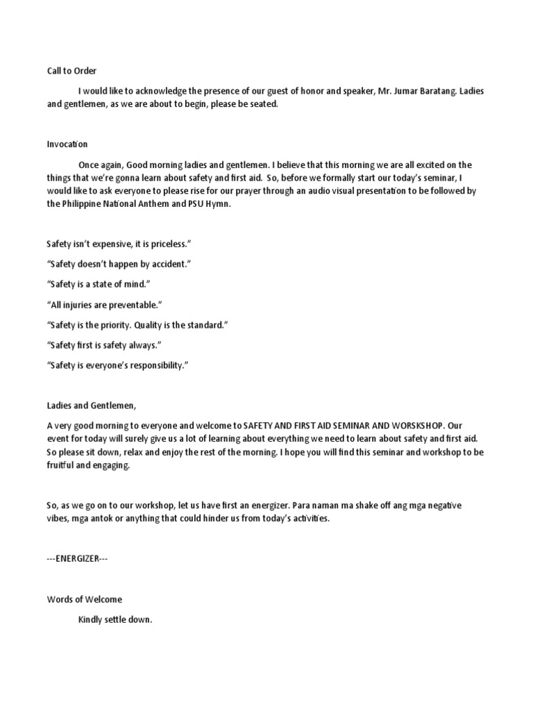 Safety and First Aid Seminar and Workshop: Call to Order Invocation