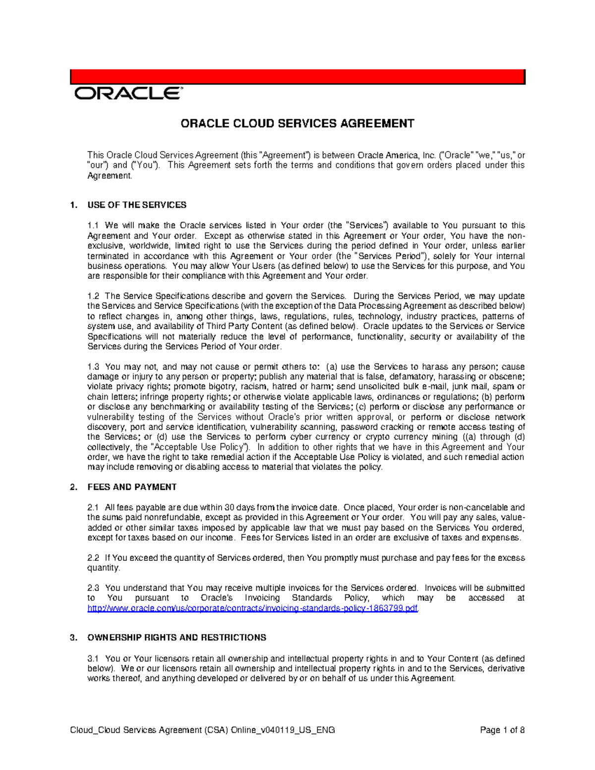 Cloud csa us eng v040119 ORACLE CLOUD SERVICES AGREEMENT This Oracle
