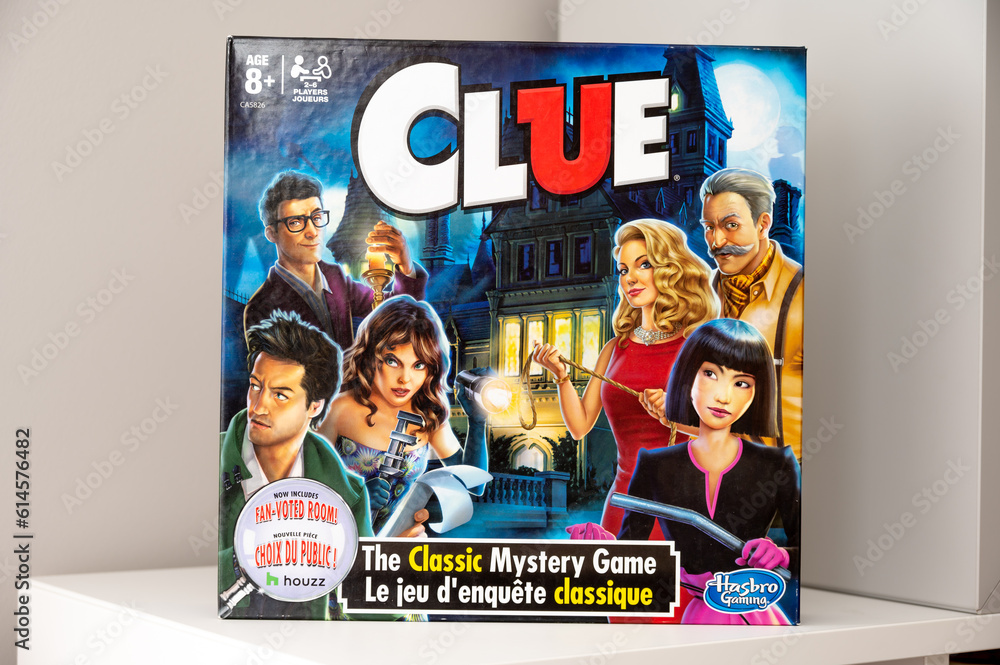 Calgary Alberta June 17 2023: Cover of a Clue board game set Stock