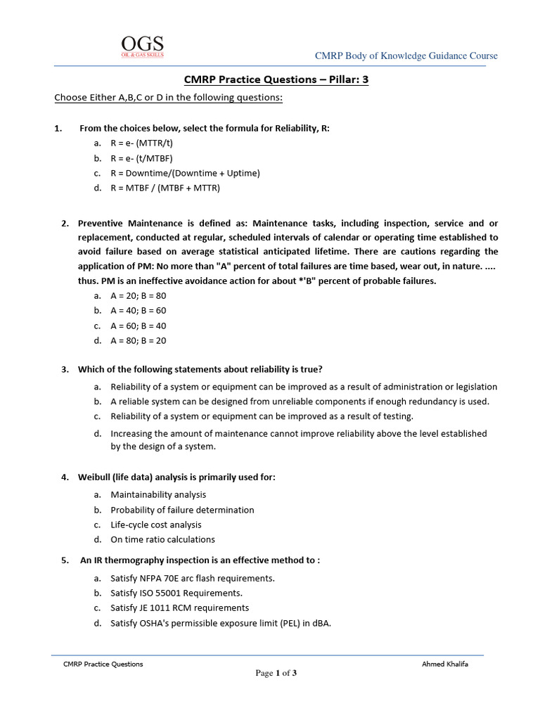 CMRP Practice Questions P3 OGS PDF Reliability Engineering