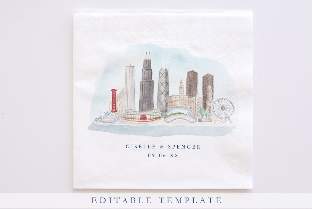Chicago Skyline Cocktail Napkin TEMPLATE Editable Wedding Napkin