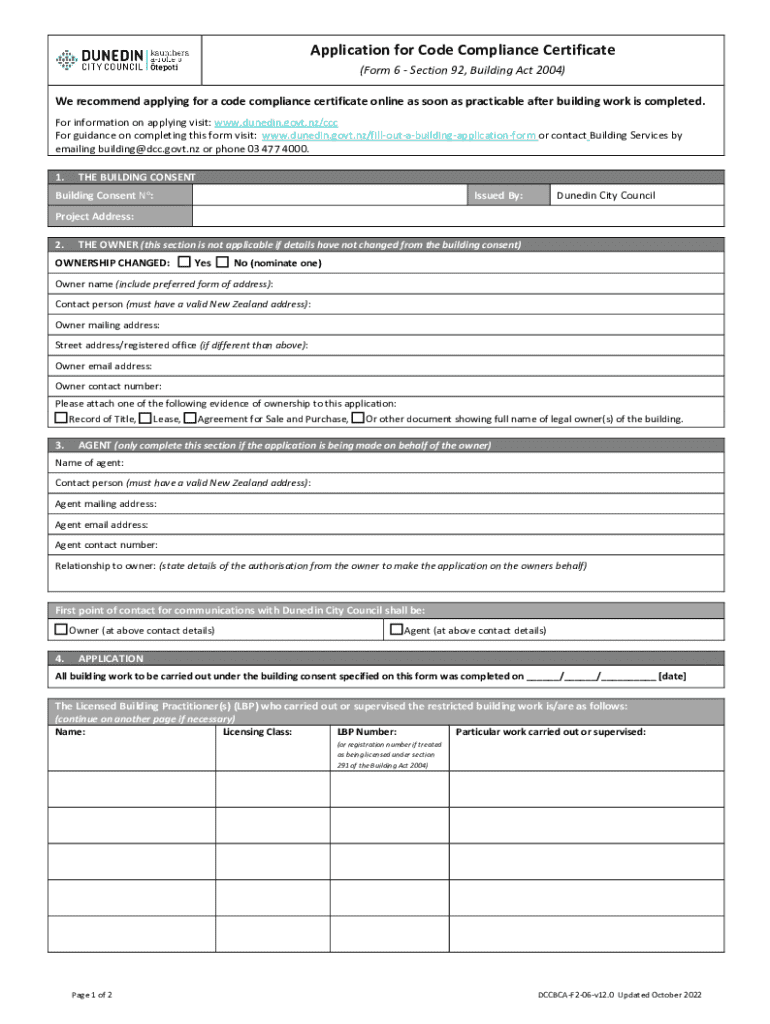 Fillable Online Code compliance certificate Dunedin City Council Fax