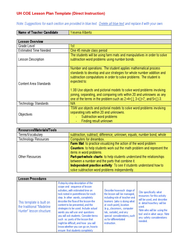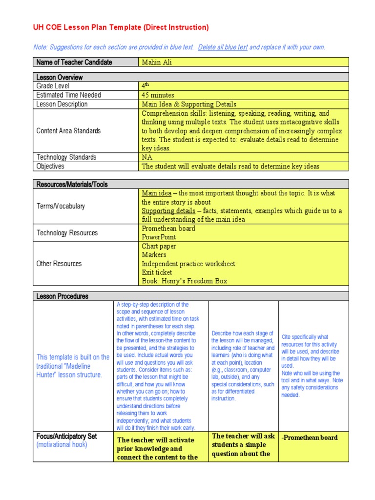 UH COE Lesson Plan Template (Direct Instruction) PDF Reading