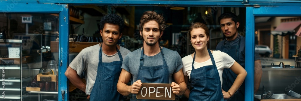 Group of diverse coffee shop workers holding an #39 Open #39 sign in front of