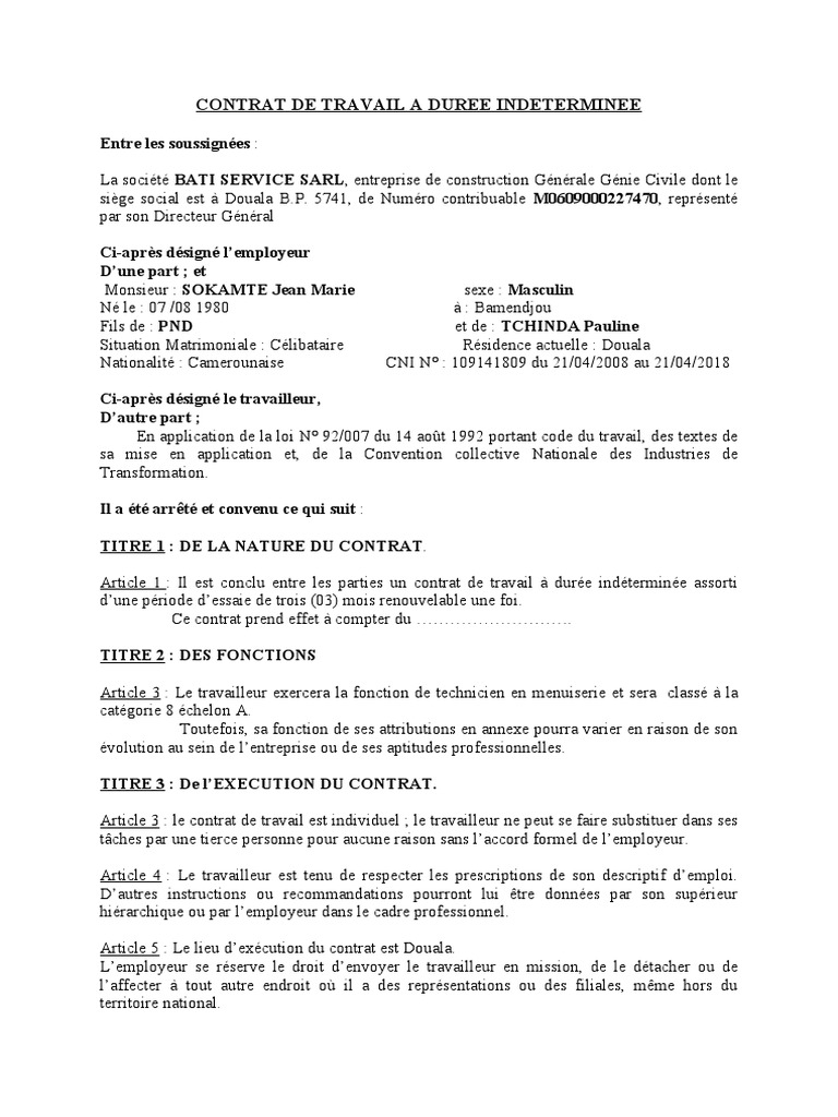 Contrat de Travail A Duree Indeterminee PDF Statuts Justice