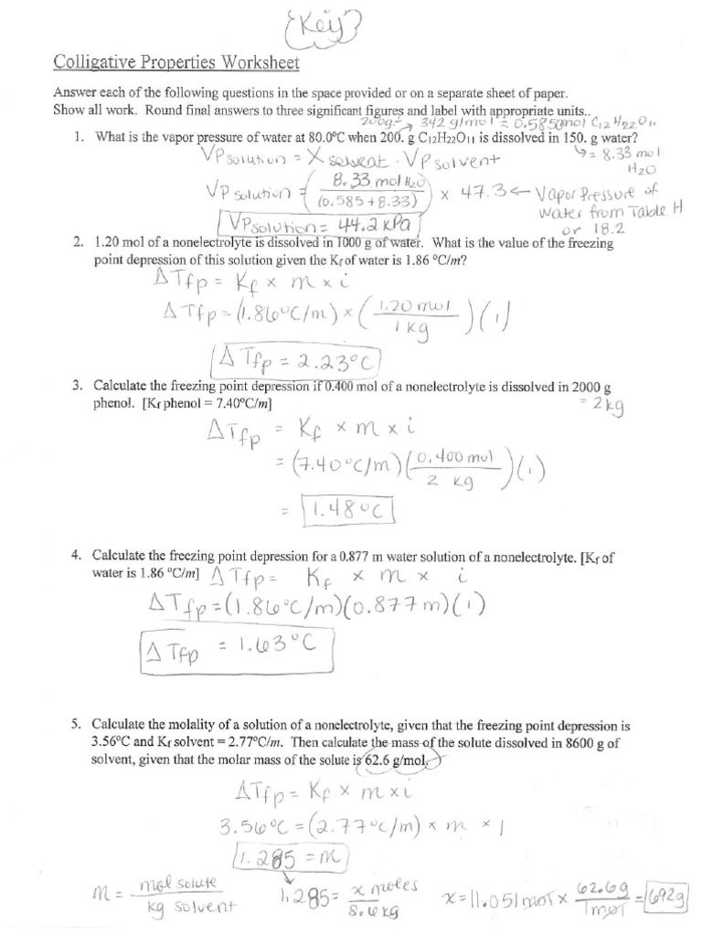Answer Keys Colligative properties Colligative Properties Worksheet