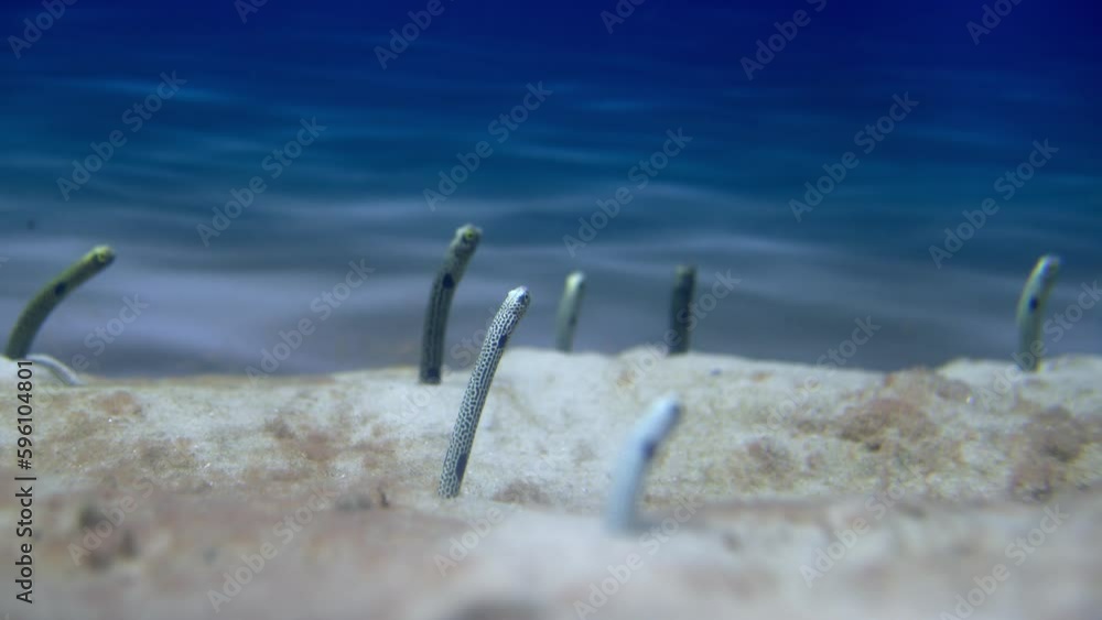 A sand colored eel emerges from the sand at the bottom of the aquarium