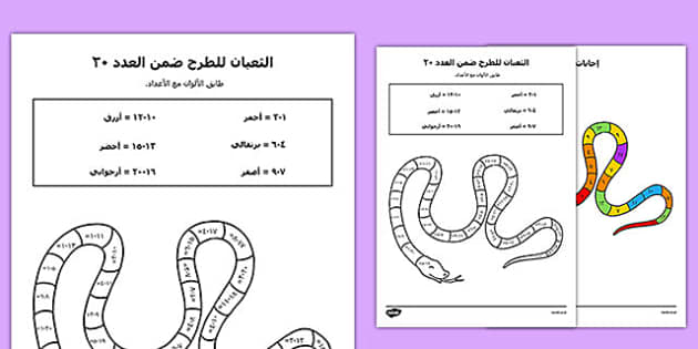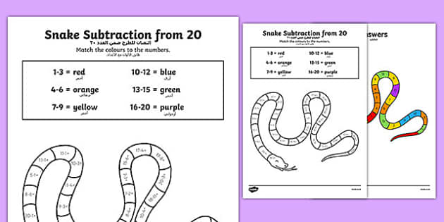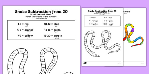 Colour Subtraction from 20 Snake Worksheet / Worksheet Arabic Translation