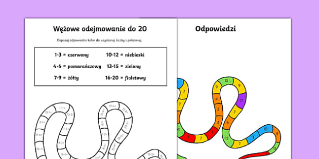 Colour Subtraction from 20 Snake Worksheet / Worksheet Polish Translation