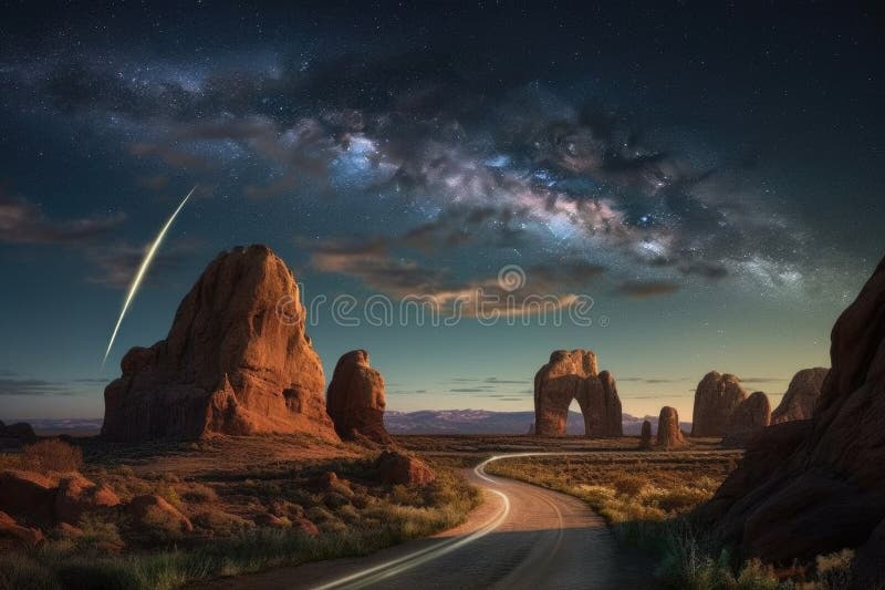 Comets Path Arching Above Famous Landmarks at Night Stock Illustration