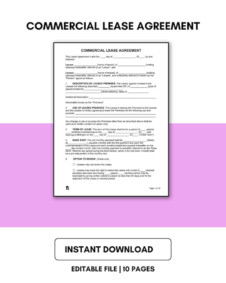 Commercial Lease Agreement Template Editable Digital Download PDF