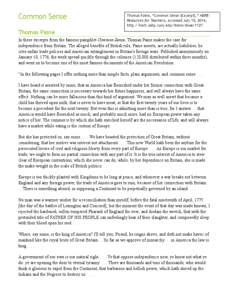 Thomas Paine Common Sense Worksheet CommonWorksheets com