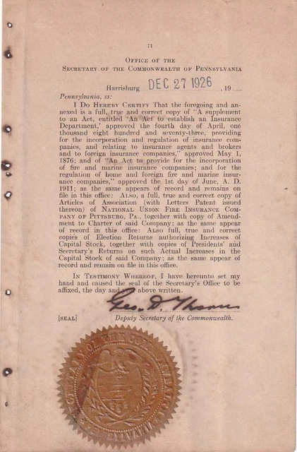 CERTIFICATE COMMONWEALTH OF Pennsylvania Harrisburg 1926 Thorn Conarroe