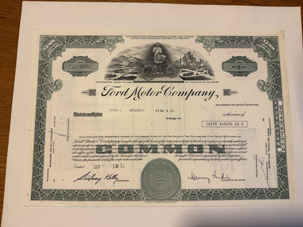 Ford Motor Company Original Aktienzertifikat von 1971 (Gebraucht) in