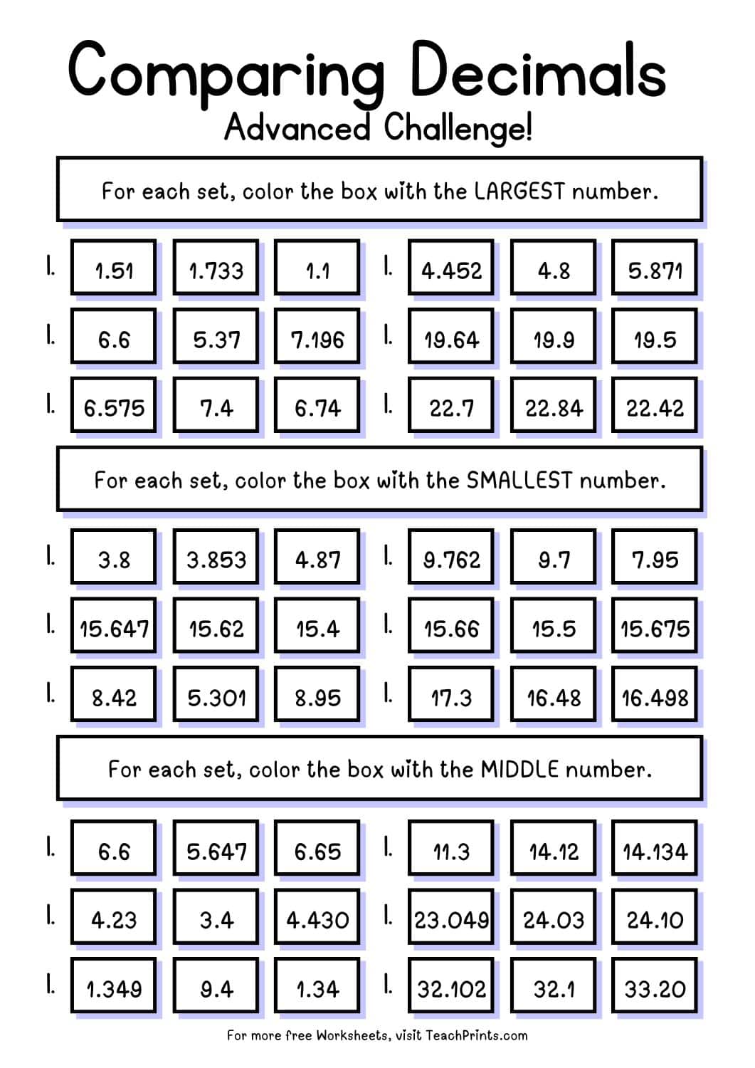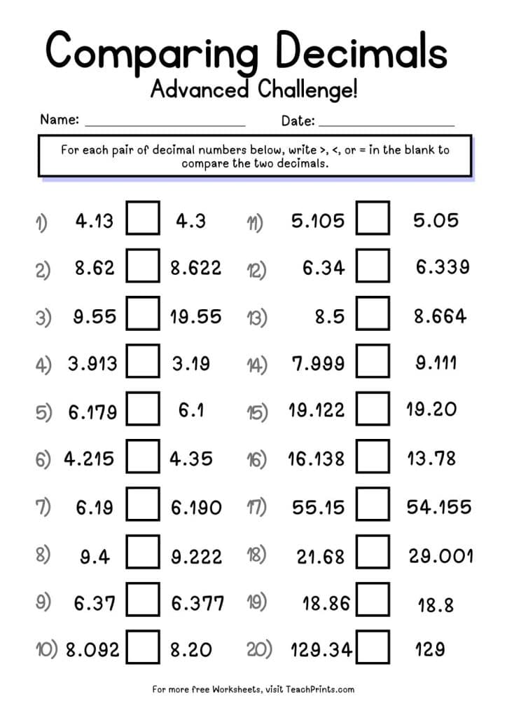 Comparing Decimals Worksheets Grade 5 Printable Word Searches