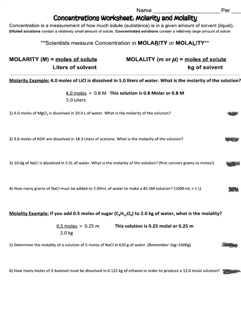 molarity molality worksheet pdf Name Per Concentrations Worksheet