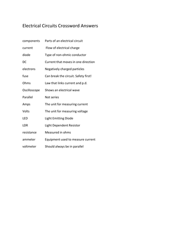 Electrical Circuit Crossword NEW 2018 SPEC Teaching Resources