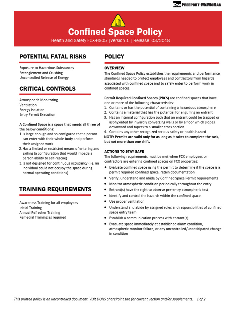 FCX HS05 Confined Space Policy PDF Hazards Labor Relations