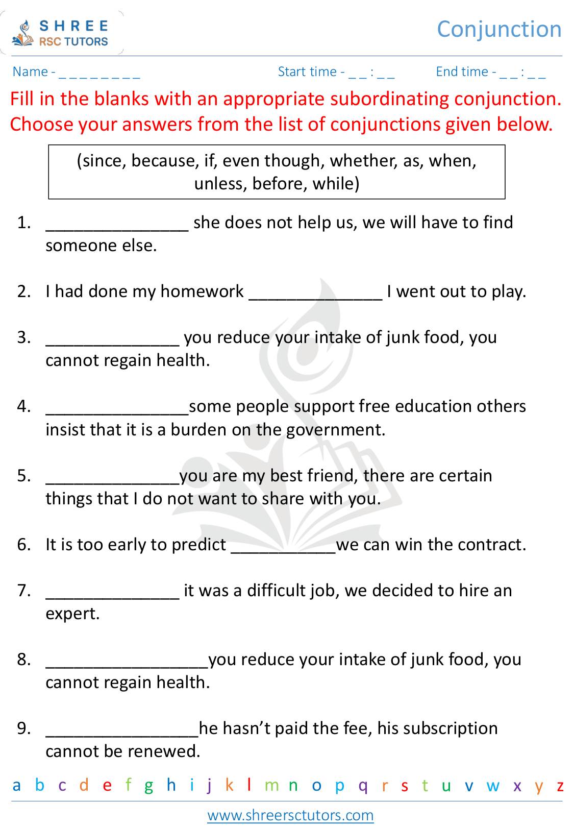 Conjunctions worksheets for Grade 5 English shree rsc tutors