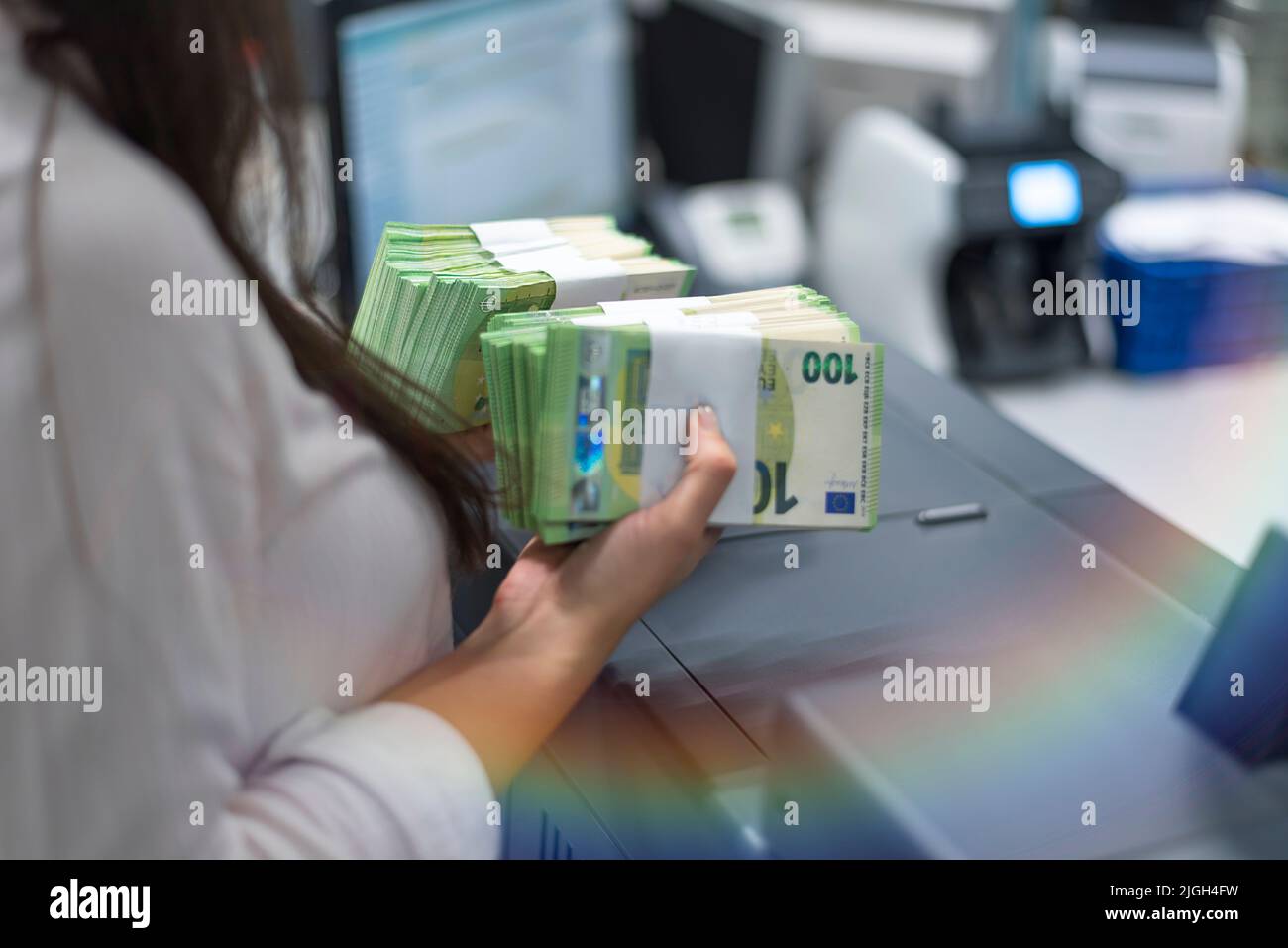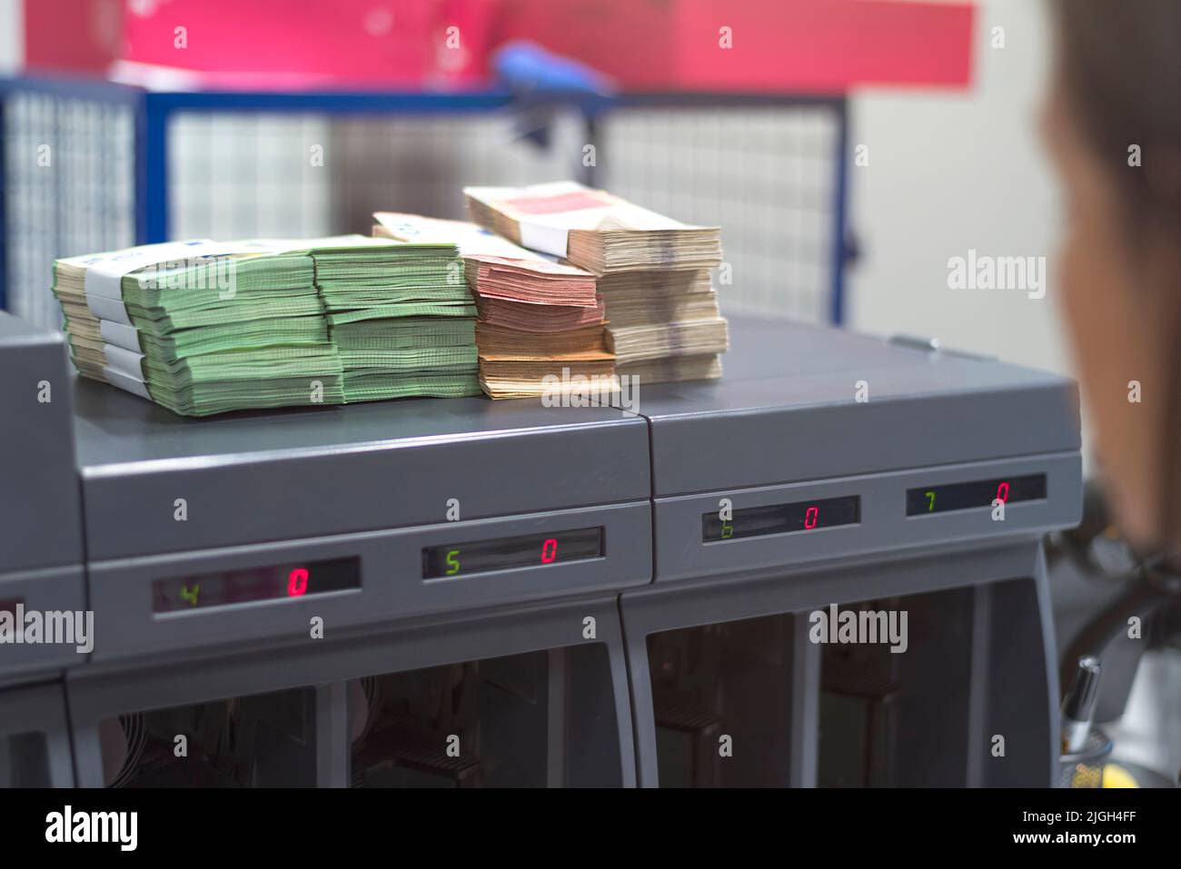 Bank Employees Using Money Counting Machine while Sorting and Counting