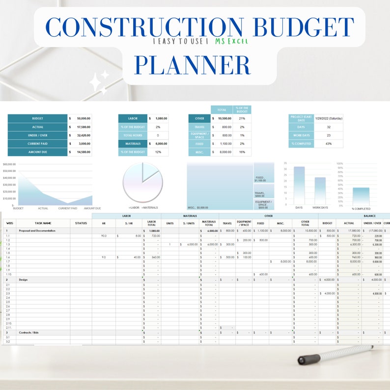 Construction Cost Budget Planner Project Management Template Etsy